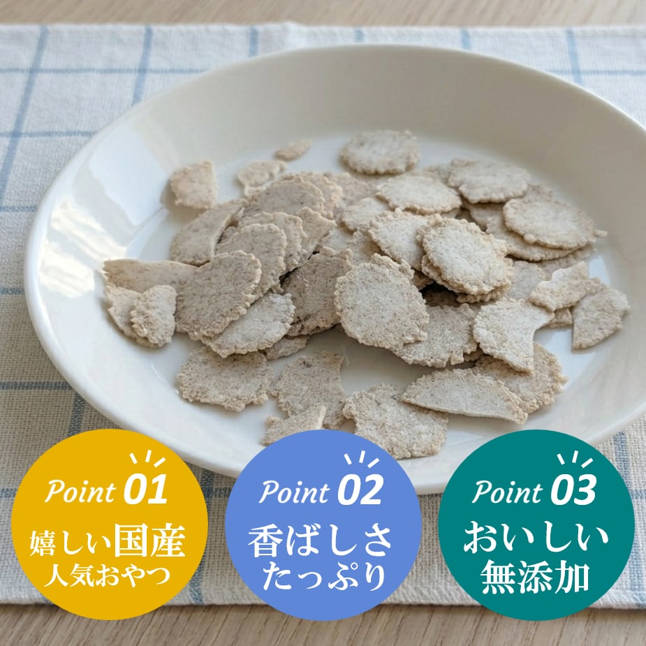 いつものおやつとしても、とっておきのご褒美としても手軽に与えることができます。グレイン&グルテンフリーな馬鈴薯澱粉で仕上げたヘルシーなおやつ。小さい仔からシニアまで幅広く与えられます。うす焼きでパリパリとした食感が楽しめます。※画像はイメージ。ご利用環境により色味や風合いが異なる場合がございます。