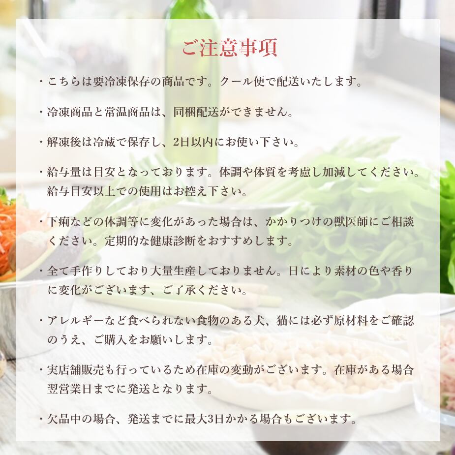 ◆【ご案内】自然の素材を使用しているため、色・形・匂いなどにばらつきがあります。肉や魚に含まれる骨や軟骨類につきましては、製造時に注意を払っておりますが、混入している事がございます。犬猫に危険な大きさの場合は取り除いてから与えて頂けますようお願いいたします。