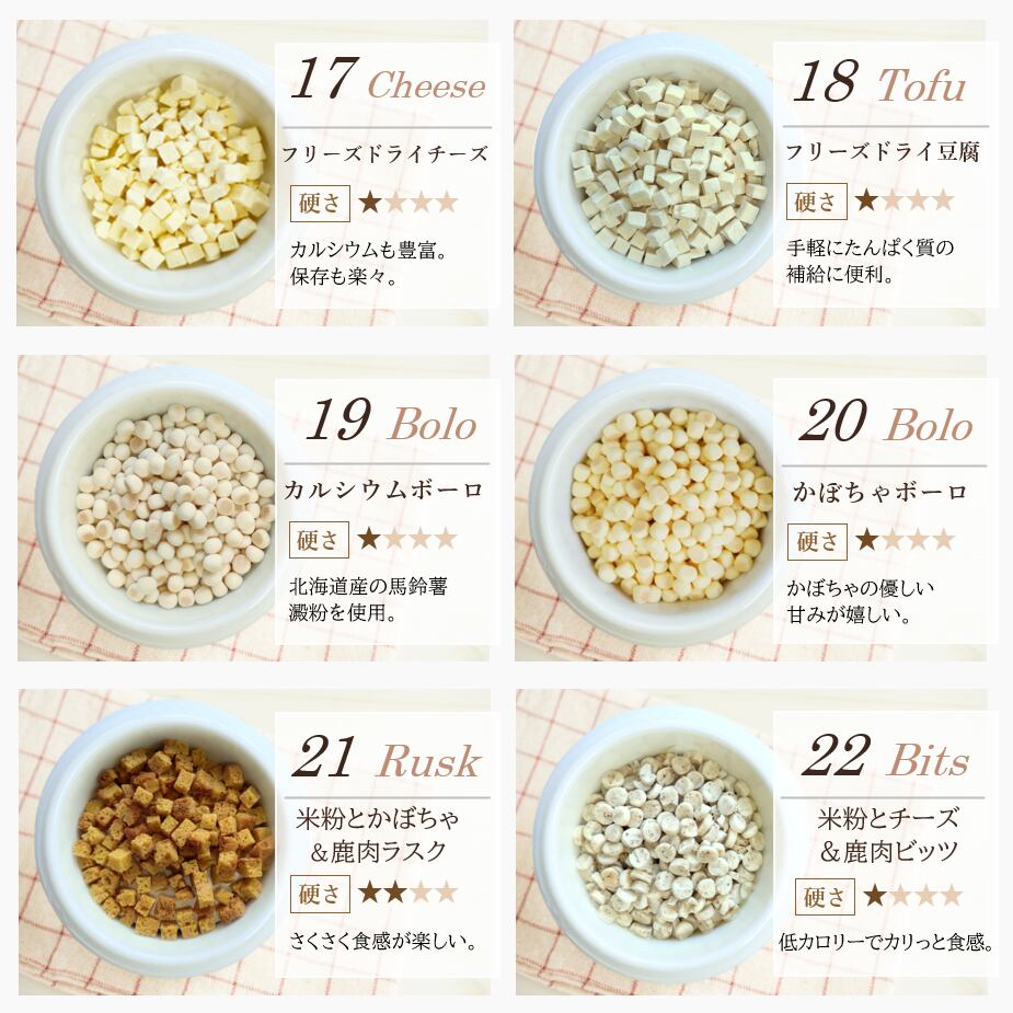 ・原材料 米粉、馬鈴薯澱粉、蜂蜜、鹿粉、チーズパウダー、オリーブ油