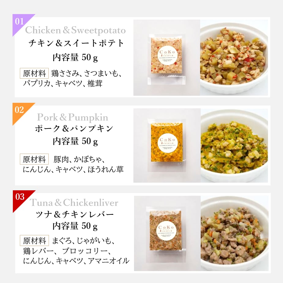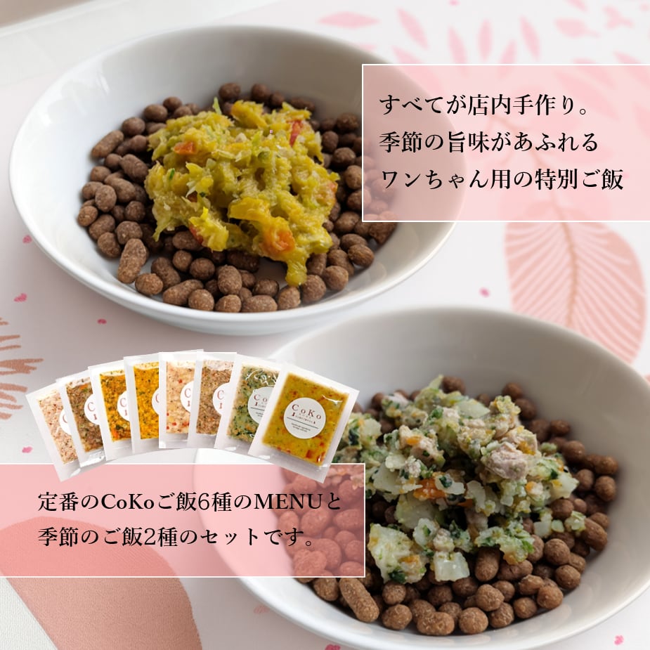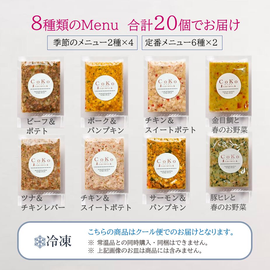 犬用の手作りご飯です! CoKoご飯オリジナルのお得セットになります。季節の肉メニュー&魚メニュー2種×4と定番メニュー6種×2 セット 冷凍 (50g×20)