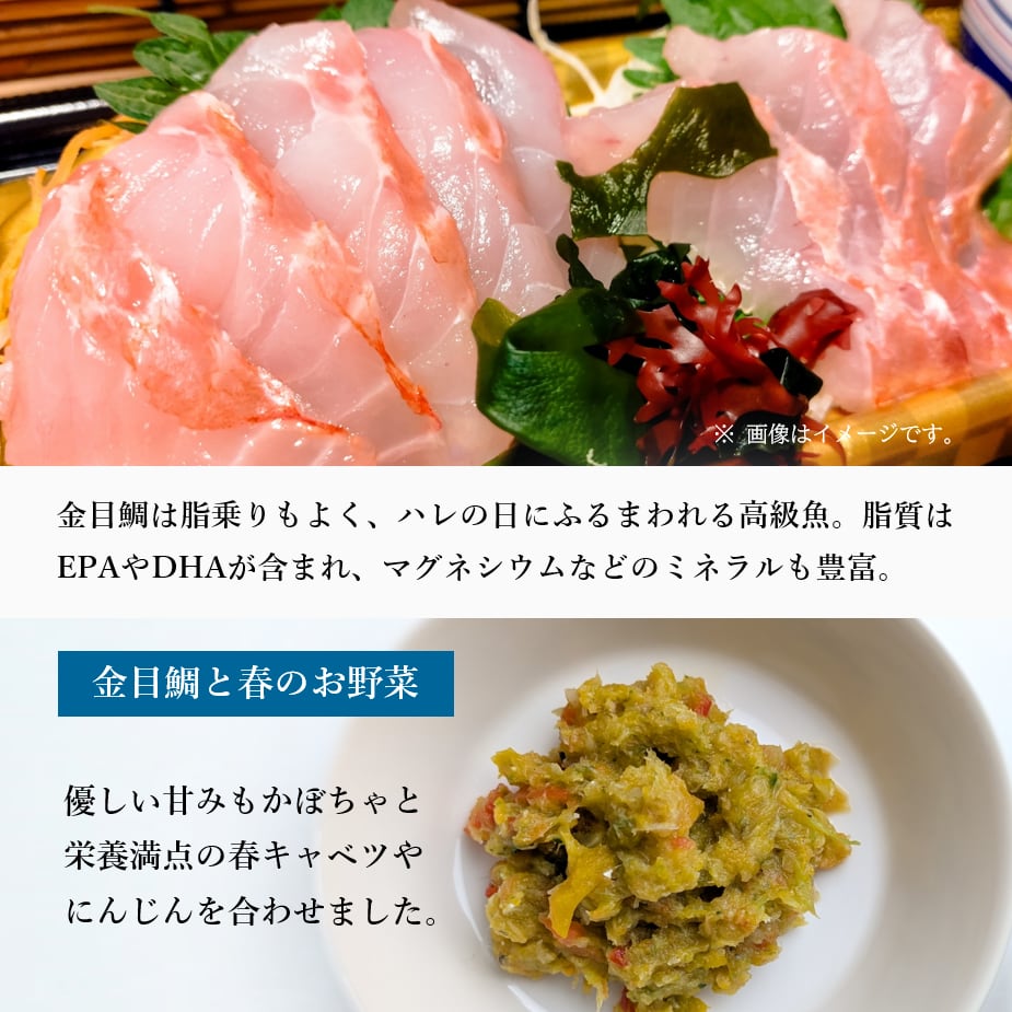 金目鯛、かぼちゃ、春キャベツ、ニンジン、赤パプリカ、菜の花、卵殻カルシウム