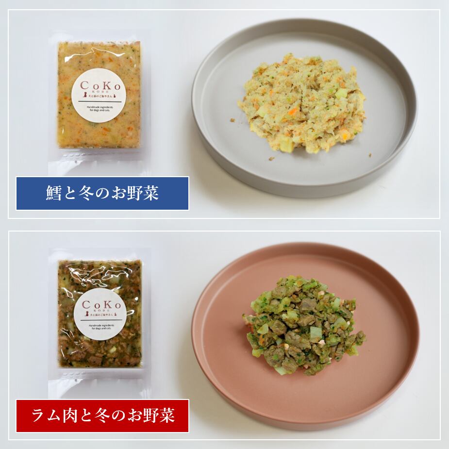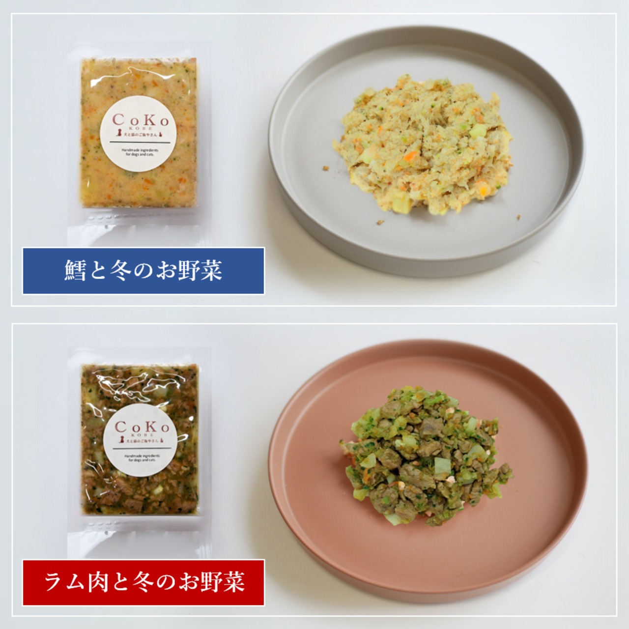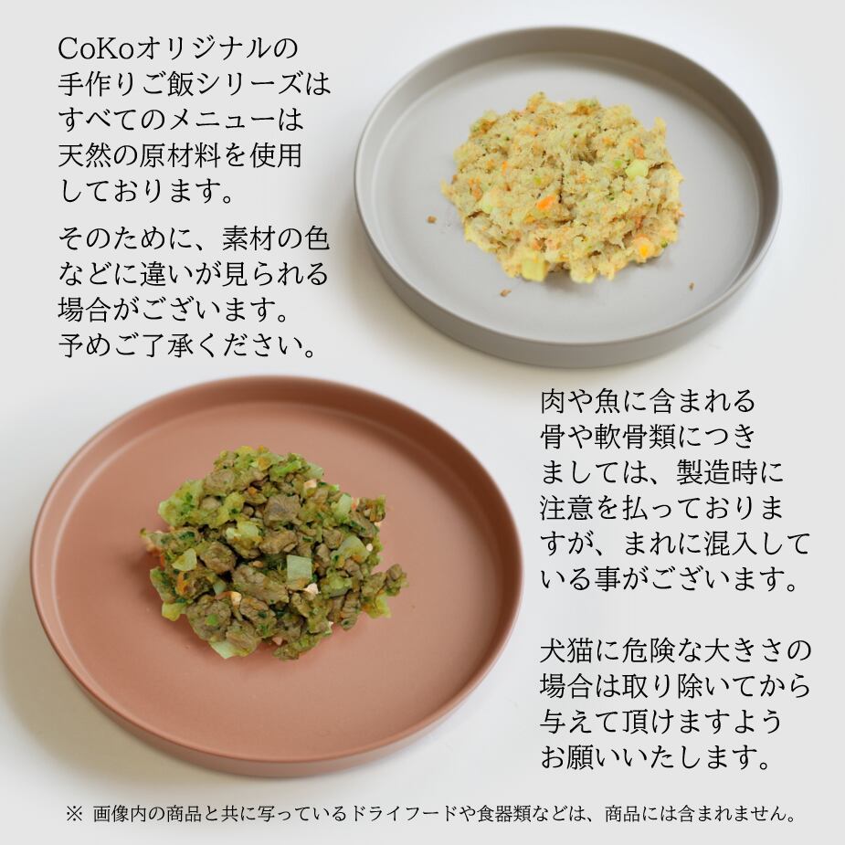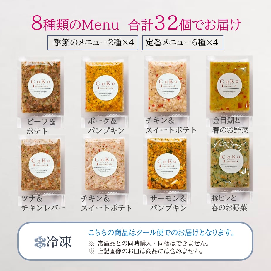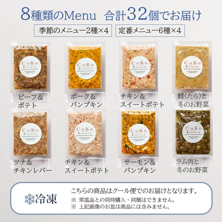 犬用の手作りご飯です! CoKoご飯オリジナルのお得セットになります。の肉のメニュー&魚のメニュー2種×4と定番メニュー6種×4セット。