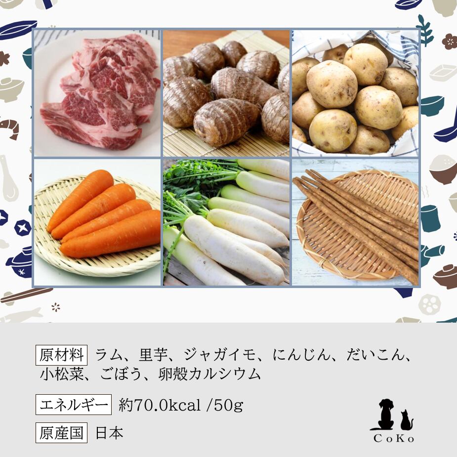 ラム、里芋、ジャガイモ、にんじん、大根、小松菜、ごぼう、卵殻カルシウム
