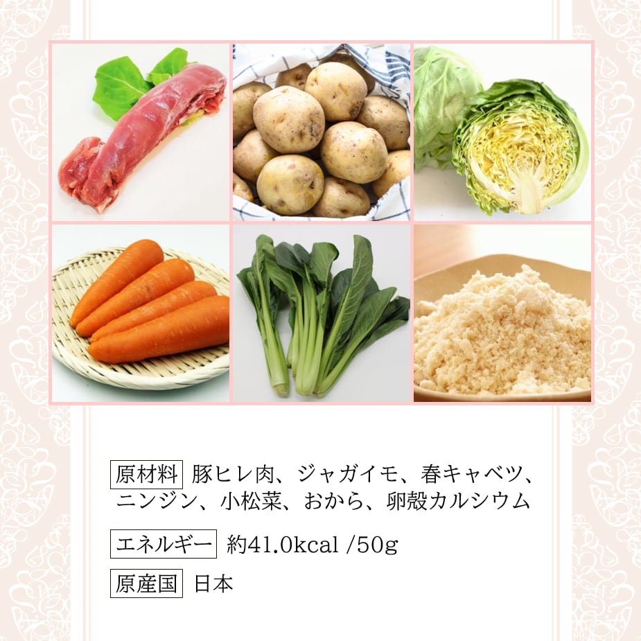 豚ヒレ肉、ジャガイモ、春キャベツ、ニンジン、小松菜、おから、卵殻カルシウム