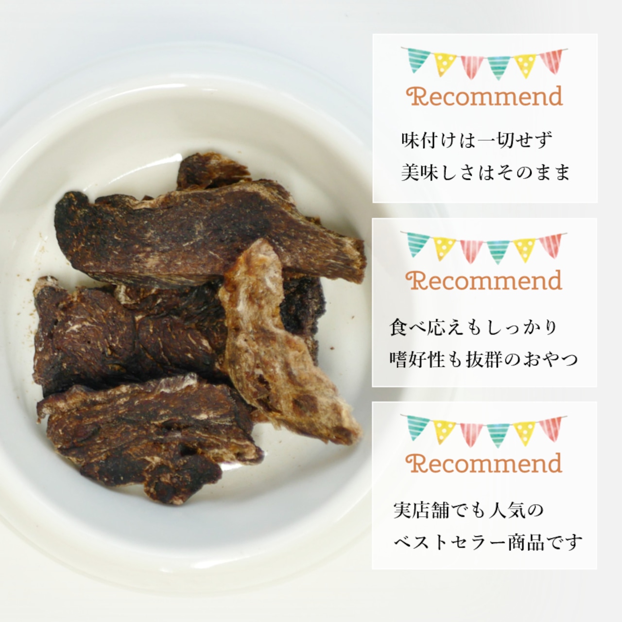 ダイエット中のワンちゃんにお薦めヘルシー素材。高たんぱく低脂肪でアレルギーが出にくいお肉のジャーキーです。合成保存料や着色料などは、一切使用しておりません。※画像はイメージです。ご利用環境により色味や風合いが異なる場合がございます。