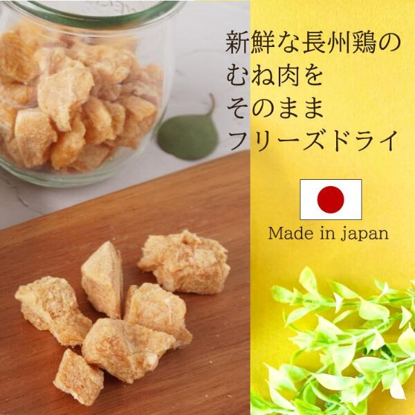 おやつやトッピングとしても使えます。抗生物質・合成抗菌剤を一切飼料に添加せず、代わりにタイム・セージ・ローズマリーを飼料に加えて育てた「山口県産 長州どり」を使用。産地だけでなく鮮度にもこだわり、養鶏場からフリーズドライに加工する工程で出来る限り空気に触れる時間を短縮して真空冷凍乾燥しました。鶏むね肉を一口サイズのキューブ型にカットしたフリーズドライおやつです。
