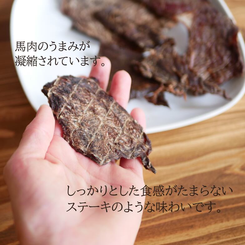馬の脂はリノール酸・オレイン酸などが非常に多く含まれています。自然な旨味の馬肉を美味しく焼上げた犬用ジャーキーです。他のお肉にアレルギーのあるペットにもおすすめです。従来のジャーキーよりも食べやすいように薄く仕上げています。タンパク質の量は牛、豚、鶏と同程度ですが、脂質が少ないのが特徴で体重管理にもお薦めの食材です。